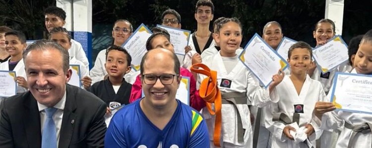 No dia 22 de abril, o Deputado Estadual Coronel Henrique participou do exame de faixa preta de karatê dos alunos do Instituto Semear, em Contagem, ao lado do presidente da instituição, Juninho Seme.
